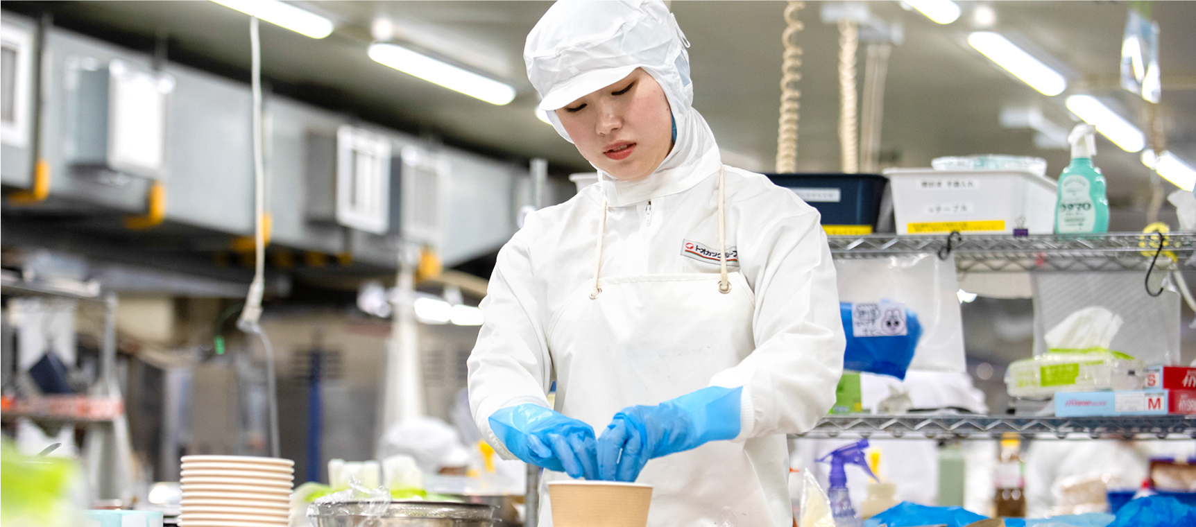 試作や改良を重ねた末に、ようやくOKをもらった後もハードルが待っています。開発したメニューを製造用のレシピに落とし込み、工場では均一にかつ時間通りに製造してもらうための準備をお願いしなければいけません。さまざまな部署の人たちの協力を得ながら、想定される課題や不安要素をなくすための改良や工夫もしていきます。商品を製造する上で必要な細菌検査や衛生管理上のルール設定、商品説明に記載されている栄養成分値といった表示に必要な検査を行うなど、関係部署との連携も重要な仕事です。